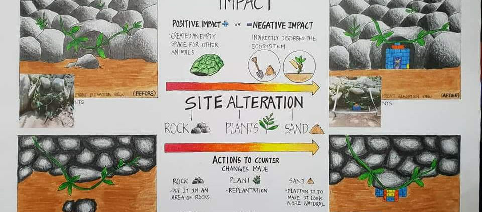 2) From the chosen natural setting above, you are to find a main suitable site, (approx. 2500mm x 2500mm size) and within the chosen main site, you need to select a shelter site (approx. 500-1000mm x 500-1000mm). The miniature shelter shall be in the shelter site. You are required to do a site study including site survey, site inventory and site analysis upon the selected site.